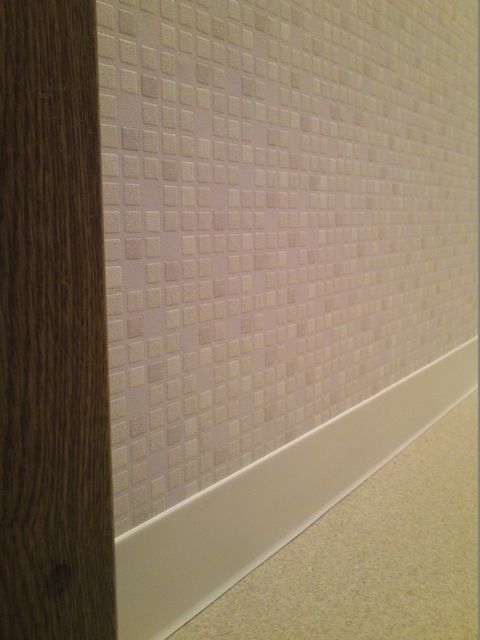洗面室内装は浴室モザイク床にリンクした壁紙